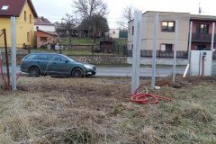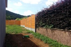 Další z plot z populární kombinace – spodní část: betonový oboustranný panel a horní část: vodorovně montované dřevěné plotovky. Plot drží pohromadě pomocí kovových, pozinkovaných sloupků. Součástí dodávky byla automatická dvoukřídlá brána a branka. Navíc jsme zde realizovali ještě zpevněné plochy ze zámkové dlažby.