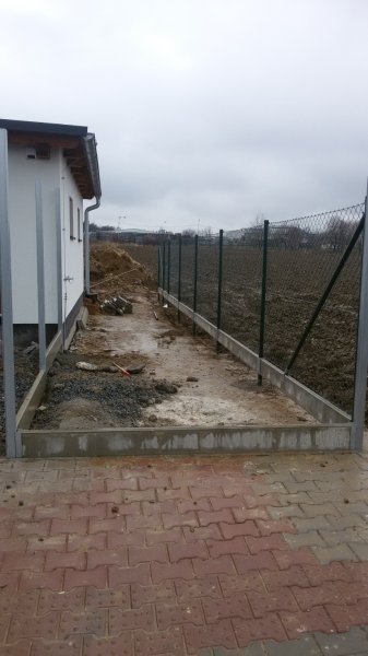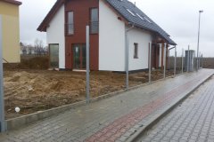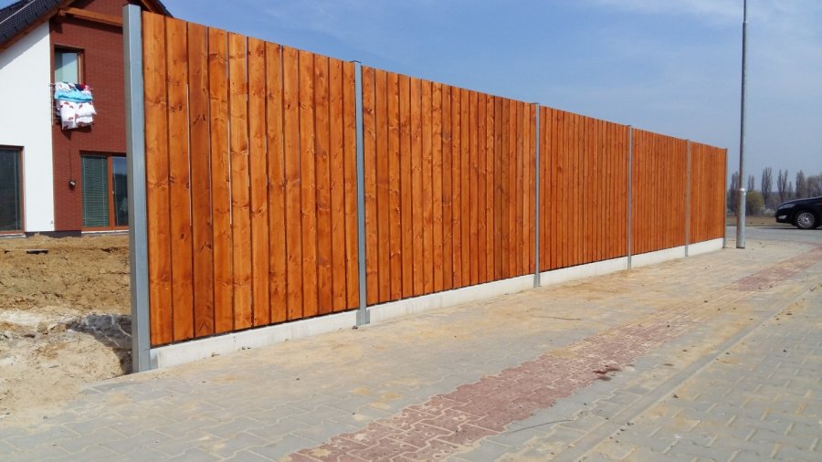 Další z plot z populární kombinace – spodní část: podhrabová deska a horní část: vodorovně svisle dřevěné plotovky. Plot drží pohromadě pomocí kovových, pozinkovaných sloupků. Součástí dodávky byla ještě branka a pletivový plot s podhrabovou deskou.