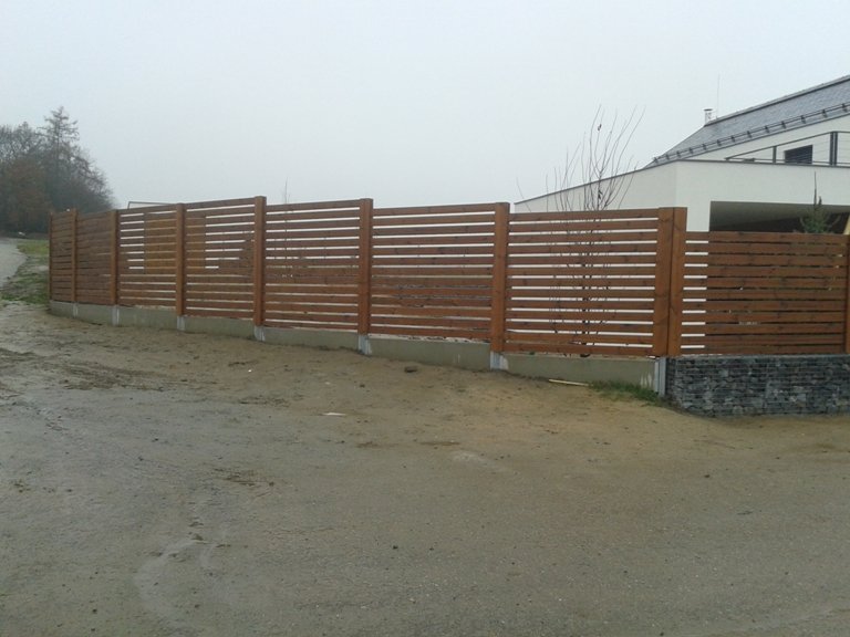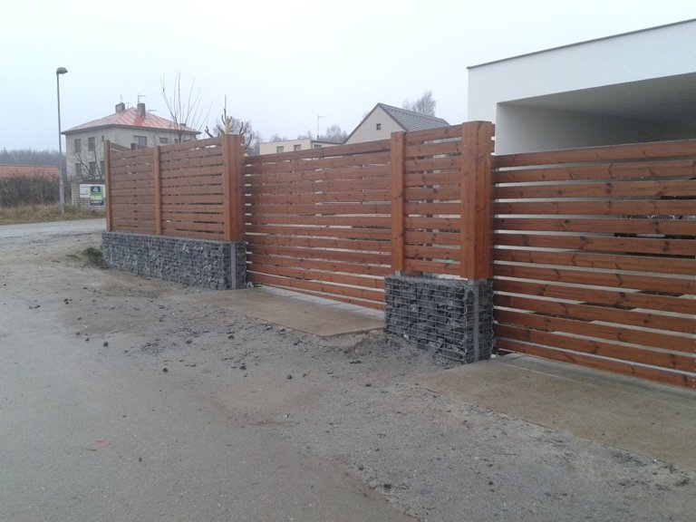 Stavba několika typů oplocení, ploty byly postaveny kolem celého domu. Přední část tvoří gabionový plot, který slouží jako podezdívka. Na tomto gabionu jsou dále připevněny dřevěné výplně, na kovových sloupcích. Výplně jsou ze sibiřské borovice – thermowood. Součástí předního plotu jsou i dvě samonosné brány, branka a nika pro popelnice. Boční, plot do ulice, je také ze sibiřské borovice, přičemž jako podezdívka je zde použita podhrabová deska. Tyto plotové desky jsou použity i ze zbývajících dvou stran, kde slouží jako spodní část pro průmyslové plotové panely. Dále zde byly zrealizovány i přístupové cesty z velkoformátové dlažby