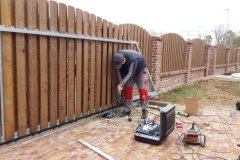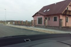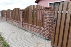 Stavba nového plotu z lícových cihel ve Staré Boleslavi. Horní část je tvořena dřevěnými plotovkami, které jsou montované vertikálně a navíc jsou vytvarovány do oblouku. Součástí plotu je i nová samonosná automatická brána a branka.