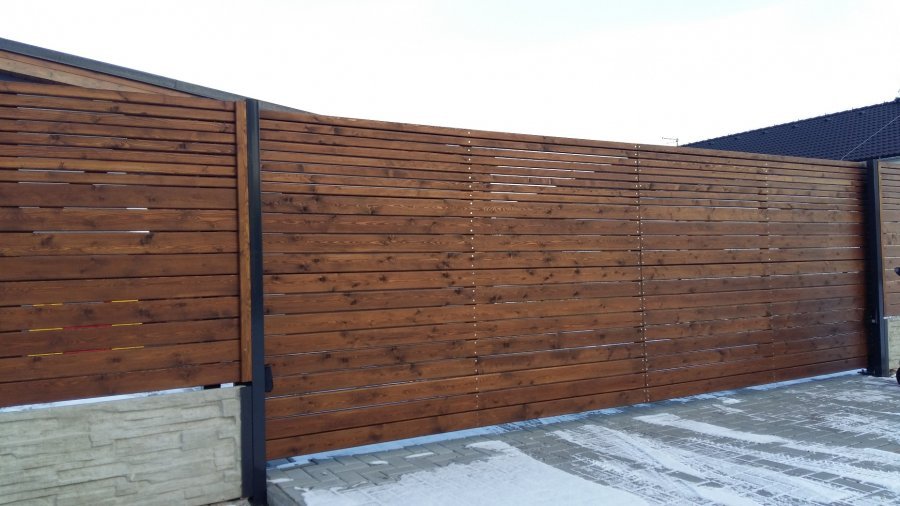 Výstavba kompletního oplocení ve Staré Boleslavi. Přední plot se skládá z betonových panelů na kovových sloupcích, které jsou stejně jako brána s brankou nabarveny práškovou barvou do antracitového odstínu. Horní část tvoří horizontálně montovaná prkna ze sibiřského modřínu, která jsou navíc ještě rozdělena na dvě šířky, což působí velice pěkný a originálním dojmem. Boční oplocené je z klasického drátěného pletiva + podhrabové desky.